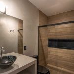 Banheiro com tema industrial com bancada e paredes em concreto aparente. Box revestido com porcelanato tipo madeira de demolição. Esquadrias, bacia, nicho e metais na cor preta.